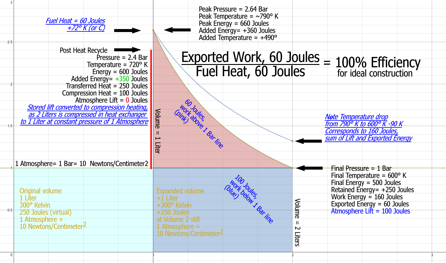 This cycle depends on only 2 well known devices with 2 equally well known properties. Below is a graph showing the cycle on Volume Pressure Plot. The Calculations are based on